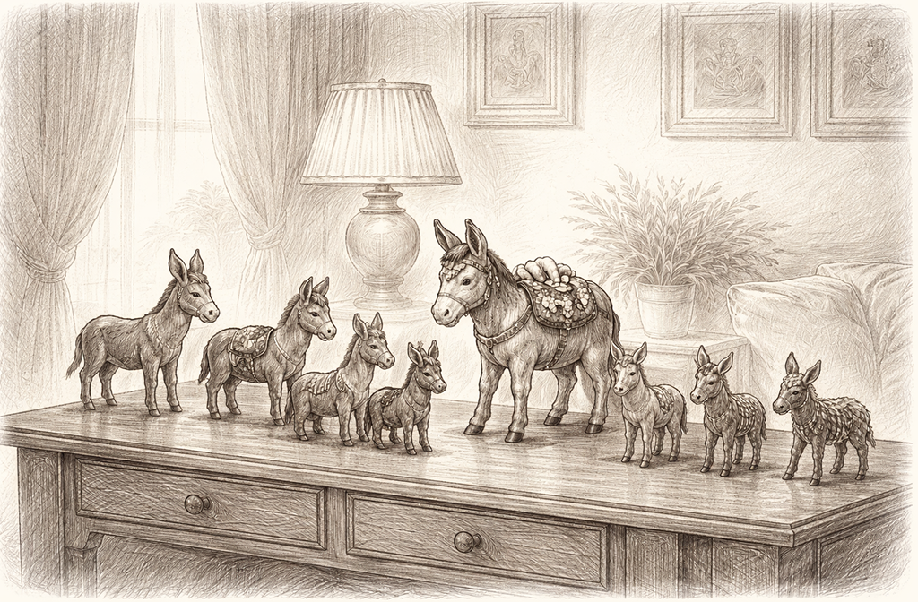 Foi como uma febre. A coleção hoje não existe mais. Aos poucos, D. Marise foi perdendo a vontade de cuidar dos bichinhos, parou de reclamar quando algum, por desventura, caía e se quebrava. A tropa foi minguando sobre o tampo do aparador. Ela espalhou os poucos que sobraram pelos mais variados cantos do apartamento; a burricada deixou de ser exibida em conjunto. Pena!