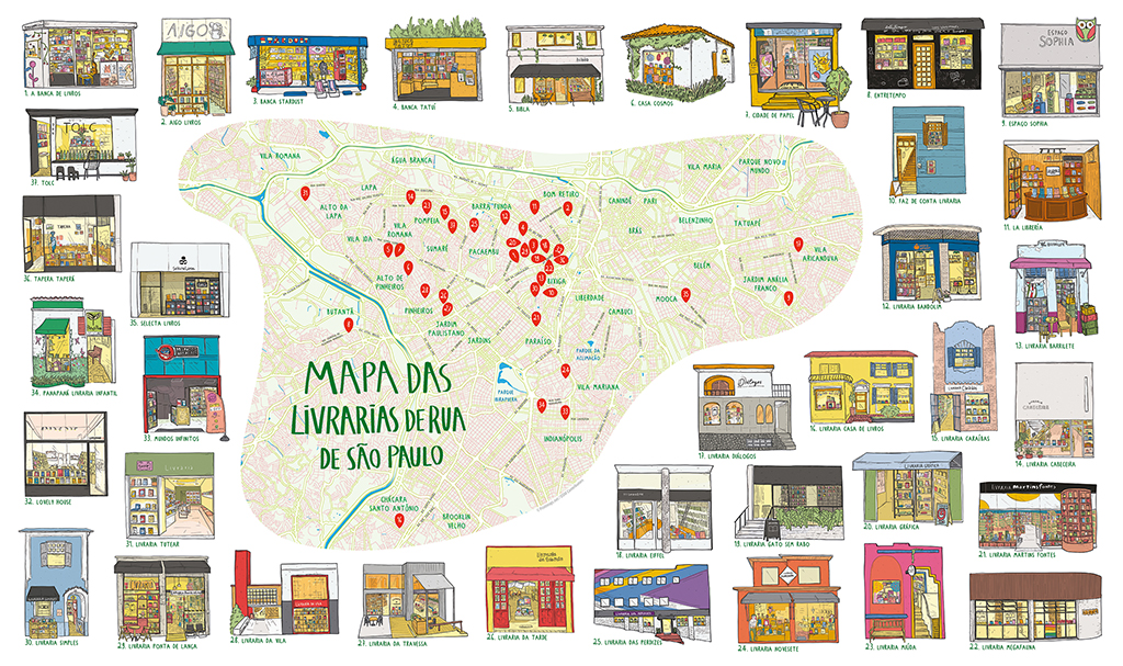 O material apresenta endereços, informações essenciais e ilustrações exclusivas das fachadas das livrarias. Os desenhos são assinados pela ilustradora Isadora Ferraz, e o projeto gráfico é do artista visual MZK. A tiragem inicial do mapa impresso é de 40 mil exemplares.